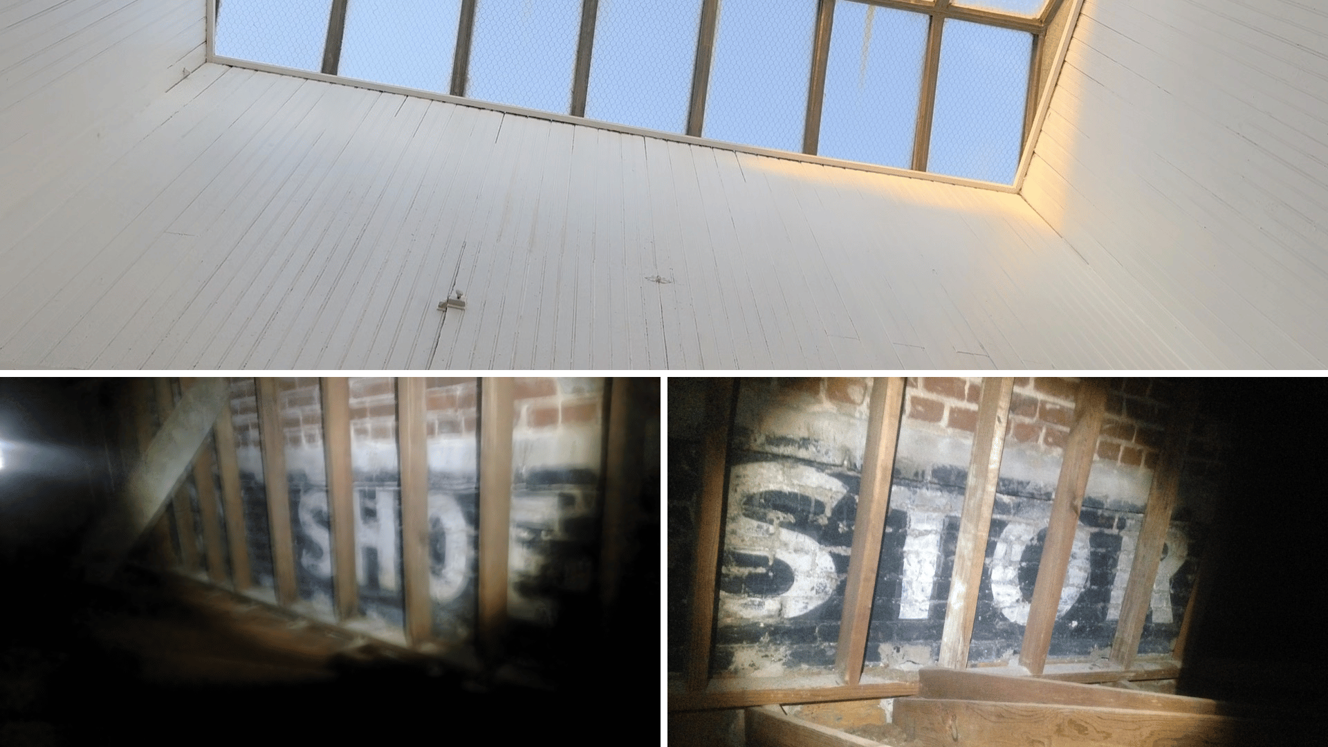 The skylights are really cool. Above the ceiling is a small attic crawl space, and because our building was constructed long after our neighbors, you can still see the original advertisement signs painted on what were once the neighboring exterior brick walls.