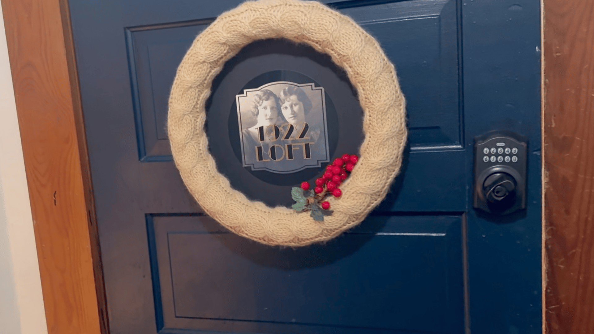 The front door needed a wreath and a sign to guide guests to the entrance. I knitted a cable panel and wrapped it around a styrofoam wreath, and I really like how it turned out.