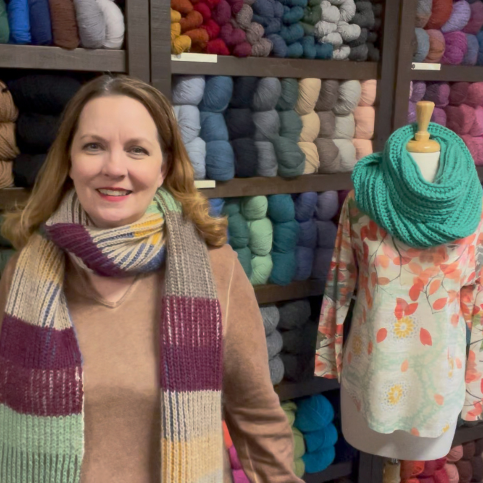 Jeannie knit Steven West's Bundled in Brioche with several shades of Rowan's Kid Classic. Two-color Brioche is a bit more tricky, but you will learn so much about Brioche while making this scarf. It is a free Ravelry download.