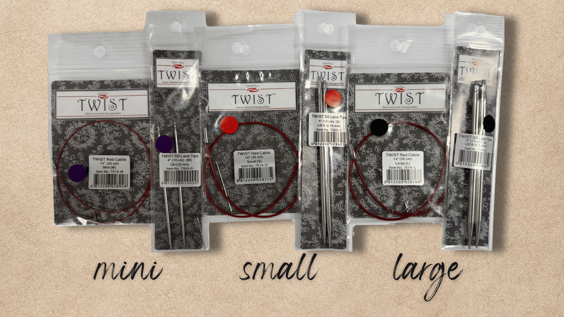 ChiaoGoo solves the size-range challenge by offering three cable categories based on connector diameter: Mini, Small, and Large. Their needle tips are categorized the same way — Mini, Small, and Large — to match the cables.