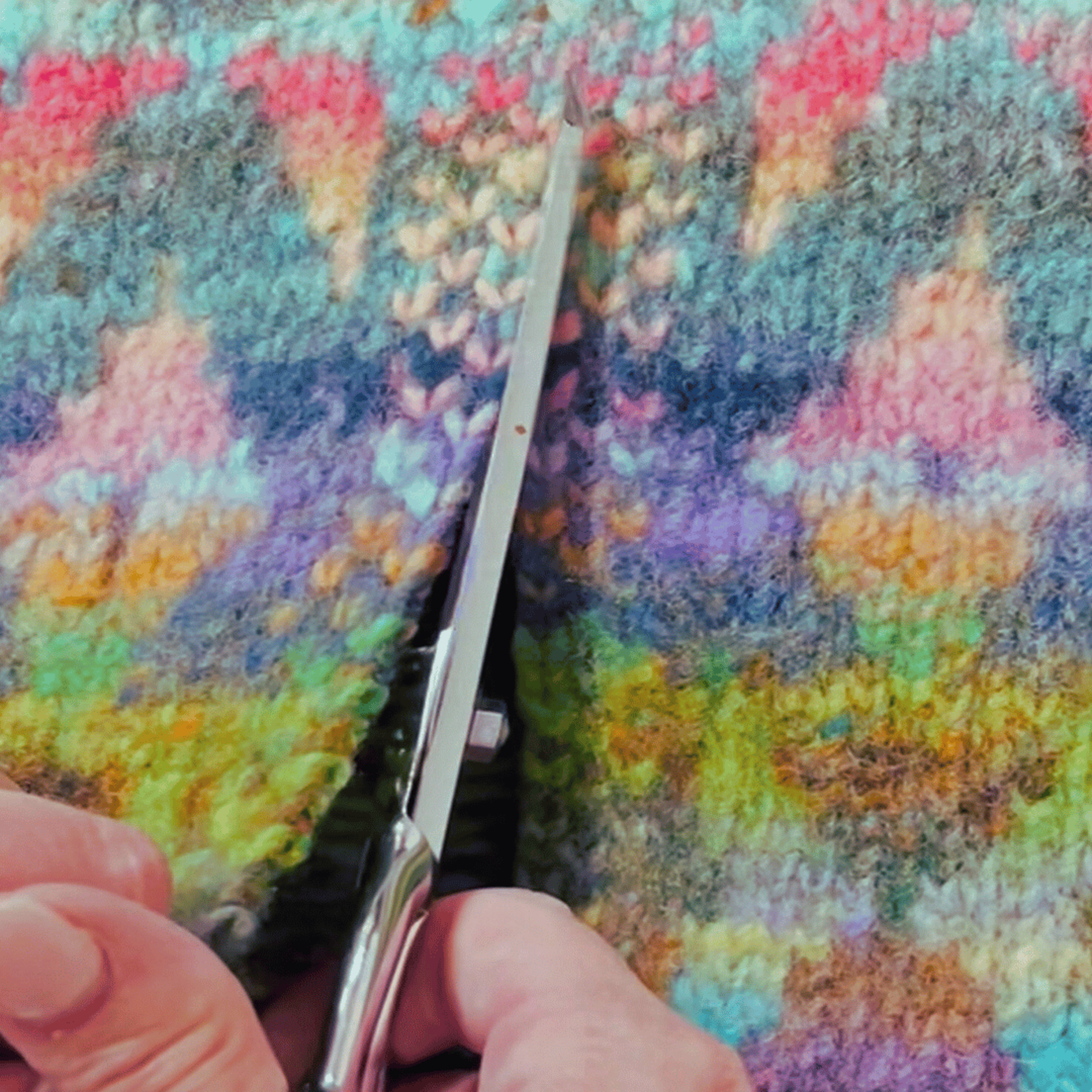Afterward, I took out the scissors again and trimmed the steek closely to the outer line of stitching.