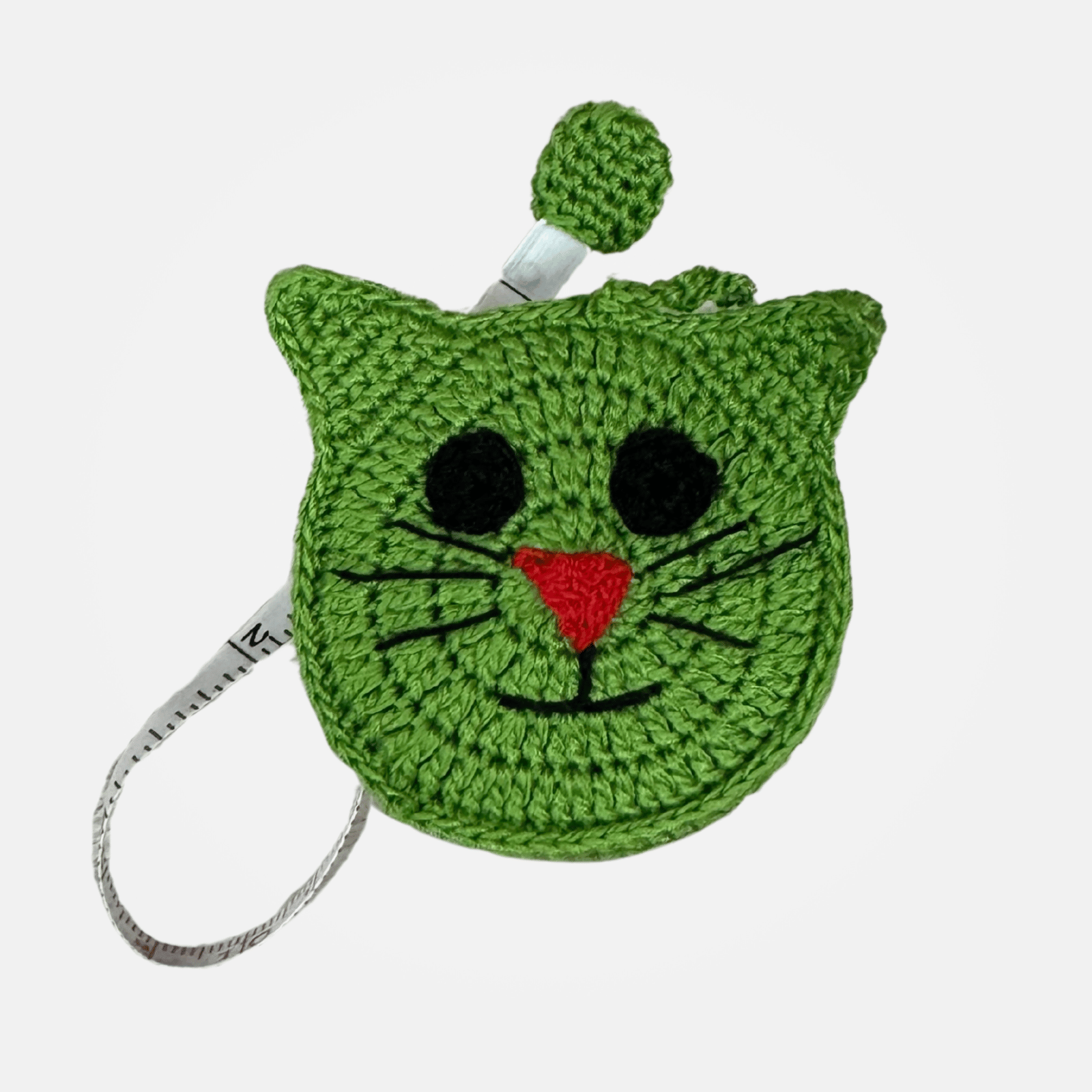 This delightful tape measure, featuring an adorable hand-crocheted kitty cat design, displays both metric and imperial measurements on opposite sides. It extends up to 5 feet in length and retracts effortlessly.
