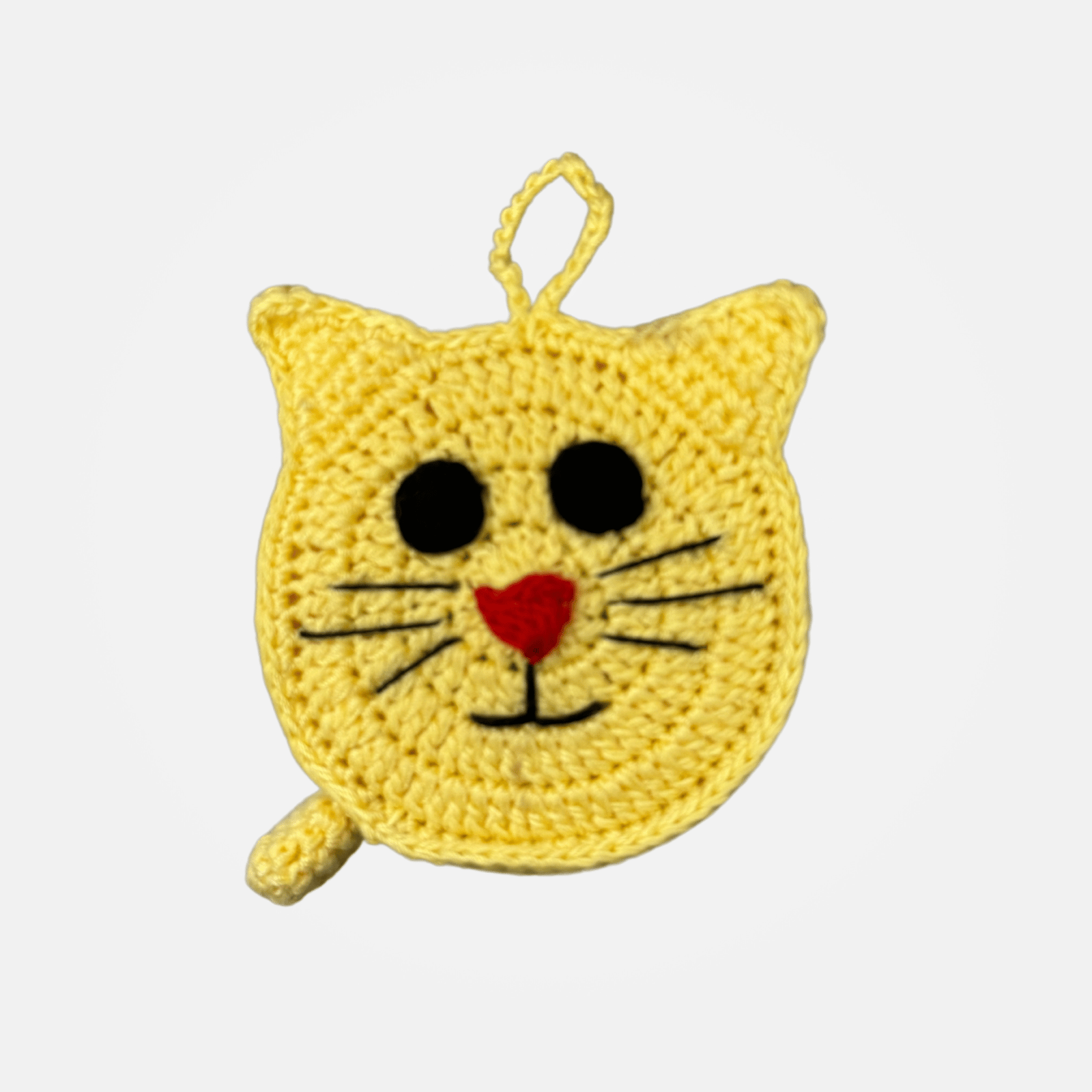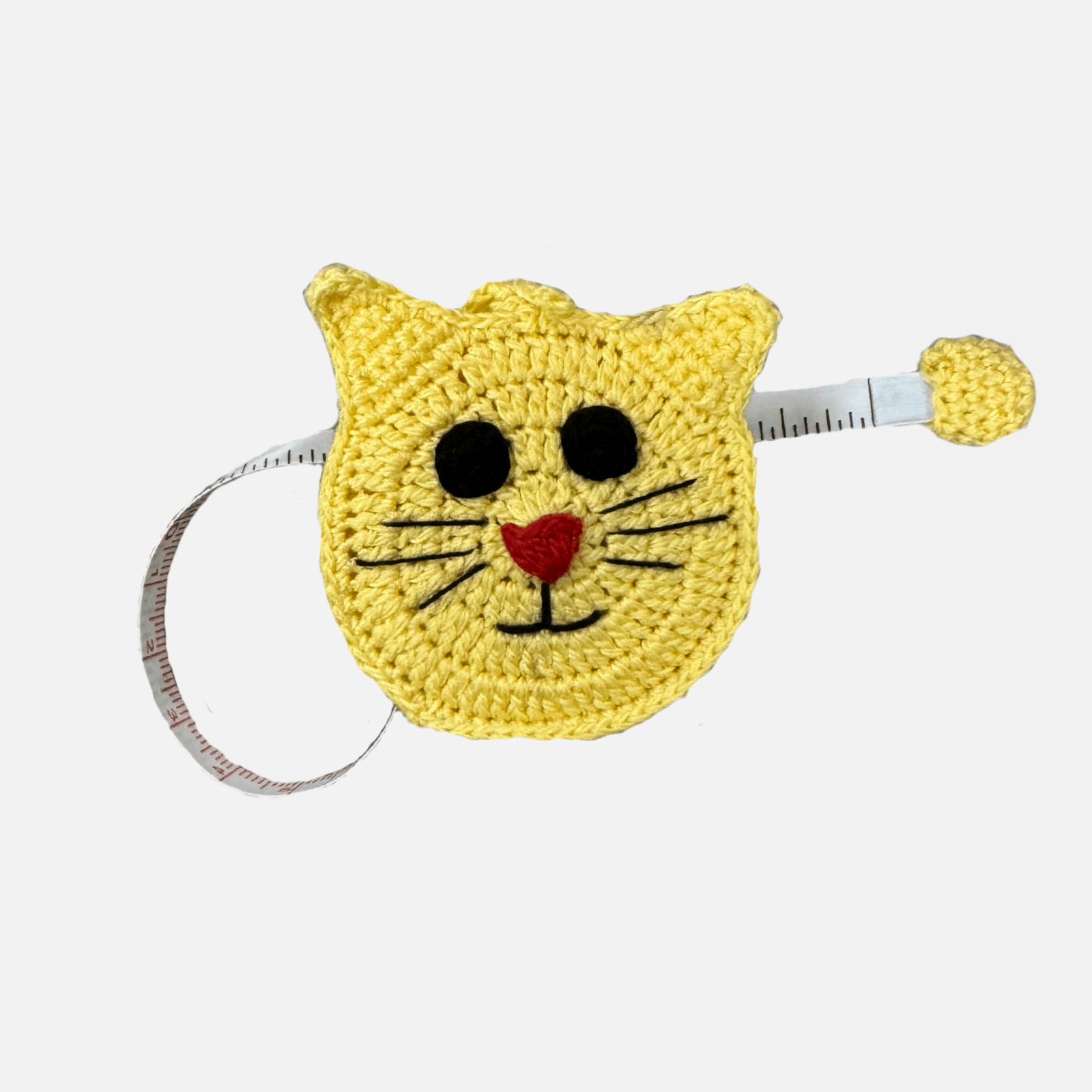 This delightful tape measure, featuring an adorable hand-crocheted kitty cat design, displays both metric and imperial measurements on opposite sides. It extends up to 5 feet in length and retracts effortlessly.