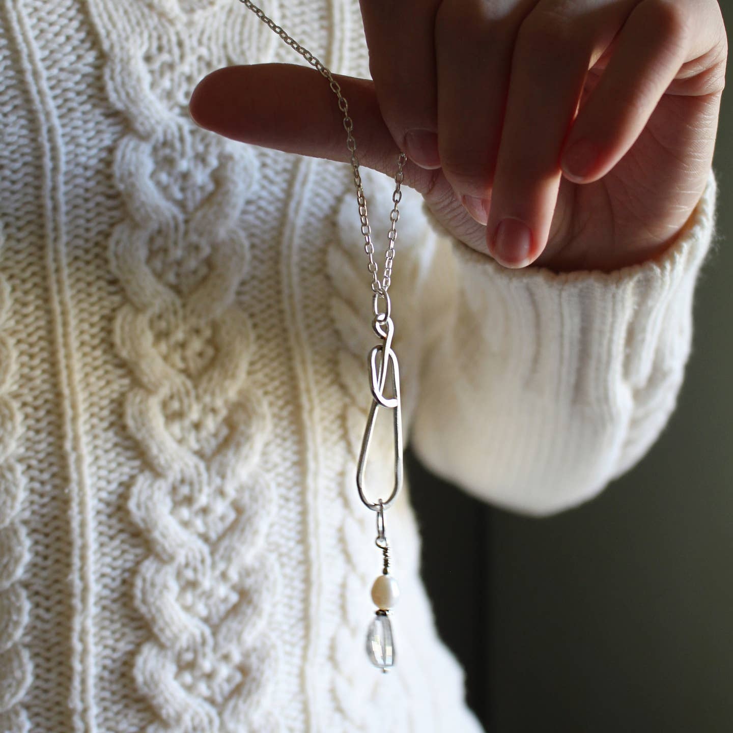 Each luxury piece in the Wool & Wire collection is handcrafted in the US from copper-core wire dipped in .999 pure silver with genuine fresh-water pearls and faceted crystals. Hypoallergenic.