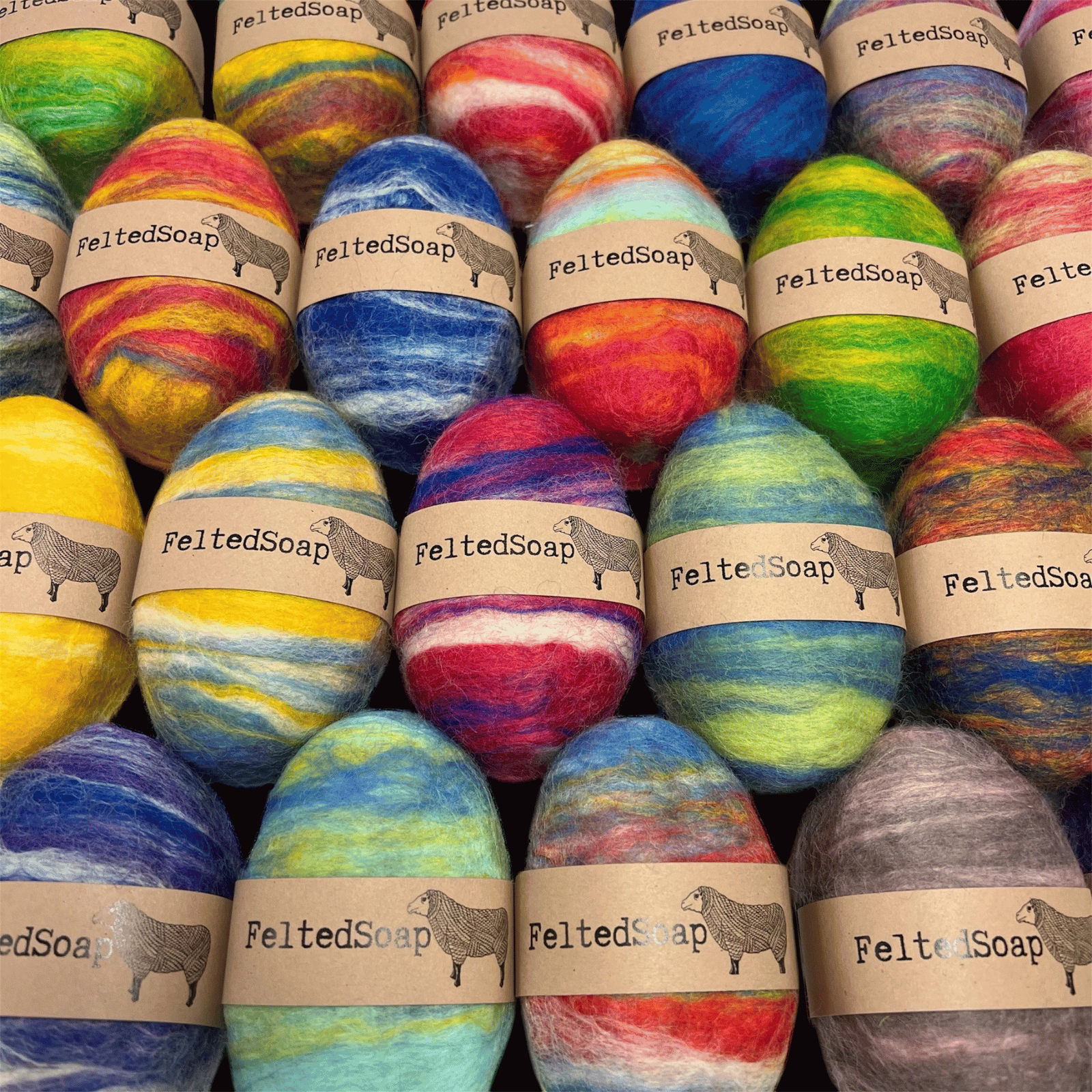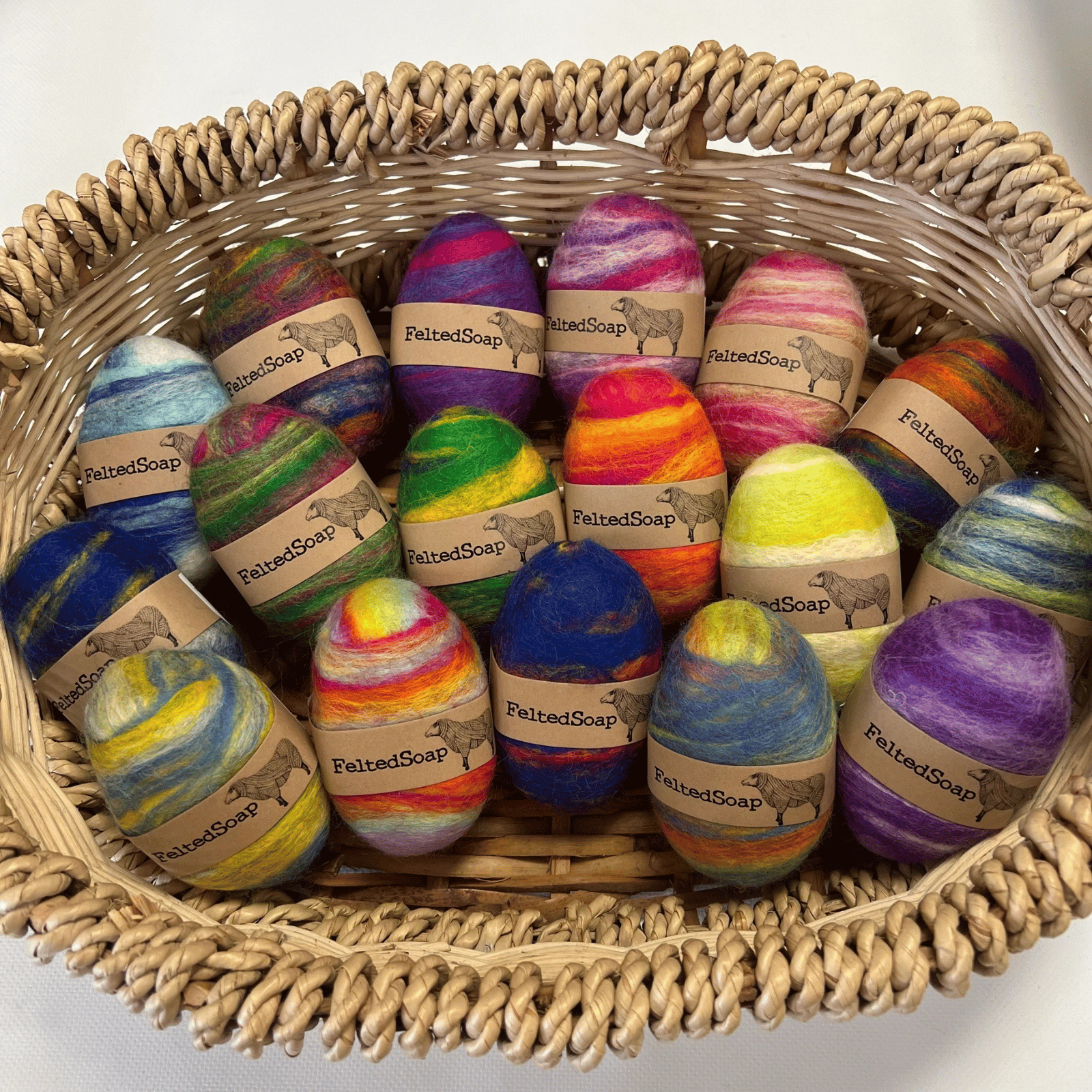 Colorful felted soap with a vibrant wool exterior that serves as a self-cleaning washcloth. There’s no need for an additional washcloth or loofah! As it gently exfoliates the skin, it removes dirt and grime while extending the life of the soap. The wool continues to shrink around the bar until only a small wool scrubby remains. It’s recommended to allow it to dry between uses.