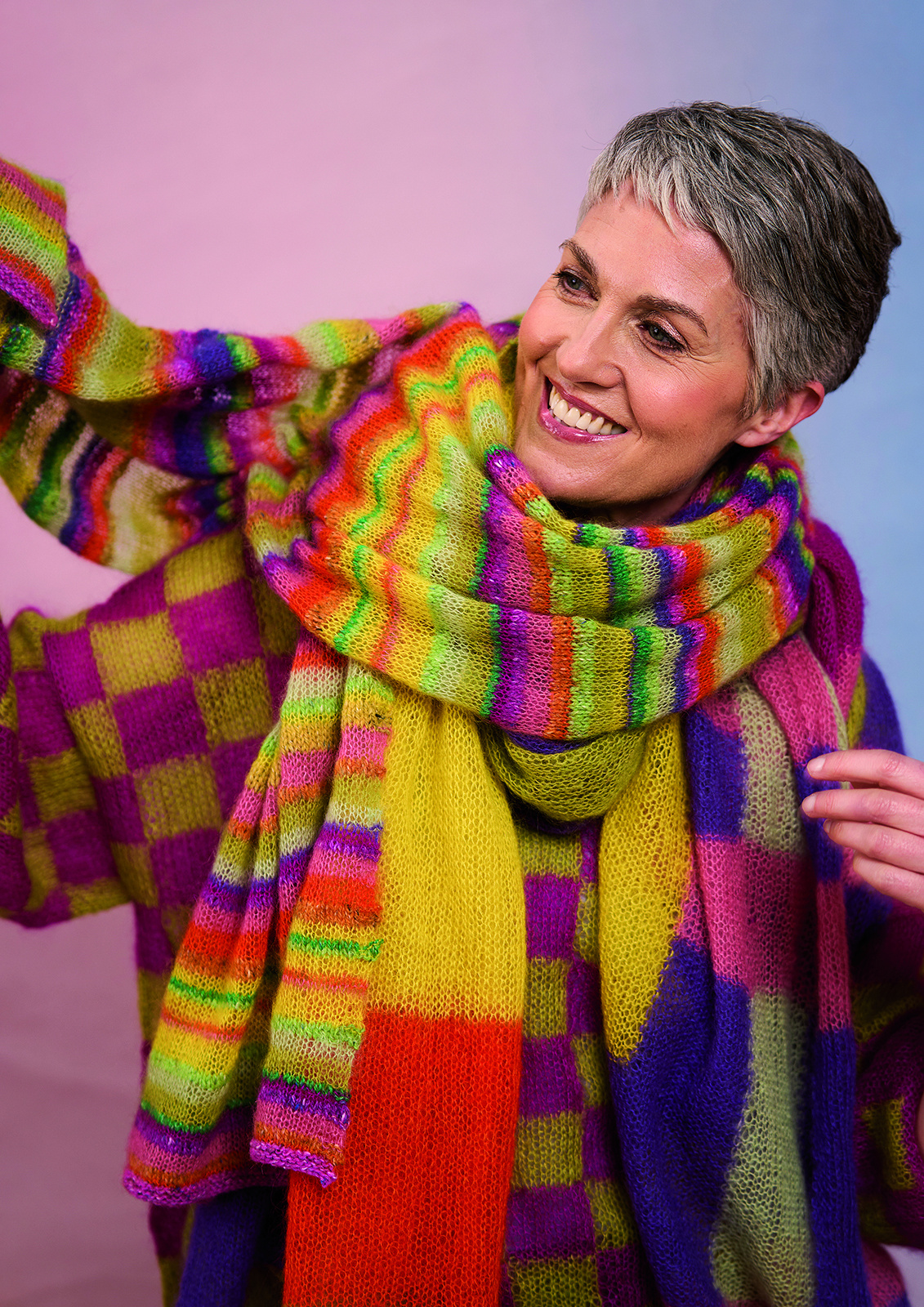 In a bright and rich palette curated by celebrated designer Kaffe Fassett, this collection beautifully shows the new shades in Felted Tweed and Kidsilk Haze. The simple, shaped designs allow the colorwork knitting to take center stage, highlighting the stunning geometric patterns and harmonious shade combinations.