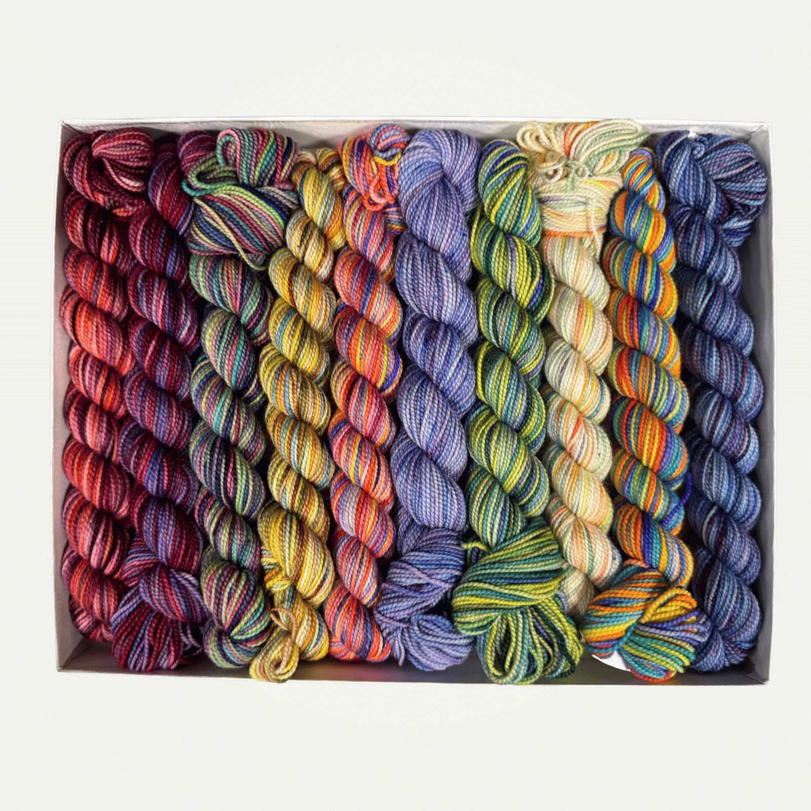 Ten beautifully paired shades of Koigu Premium Painter's Palette Merino. Each box contains a QR code that links to a variety of pattern ideas.