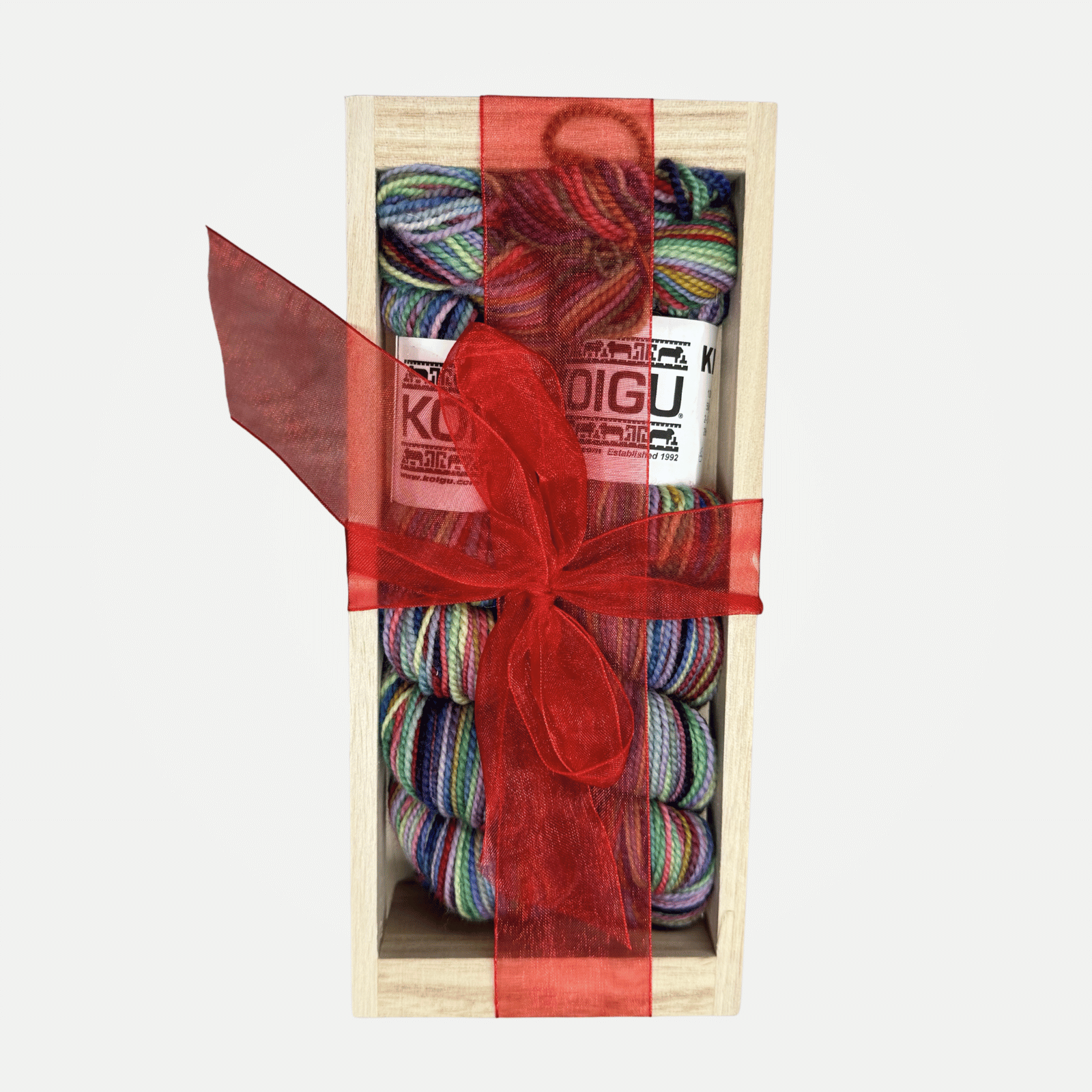 • 2 x 50g KPPPM skeins in an adorable wooden crate! Wrapped with a burlap bow and ready to gift! Perfect amount for a pair of socks, comes with a QR code to several FREE sock patterns.