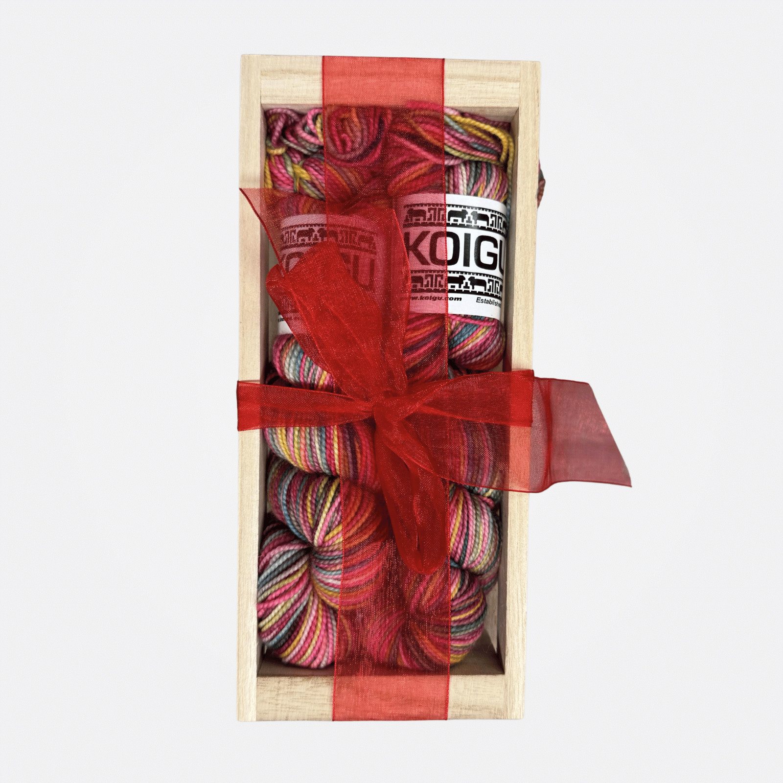 • 2 x 50g KPPPM skeins in an adorable wooden crate! Wrapped with a burlap bow and ready to gift! Perfect amount for a pair of socks, comes with a QR code to several FREE sock patterns.