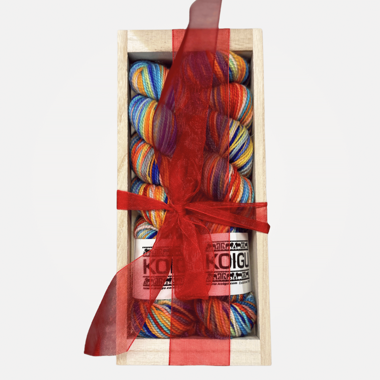 • 2 x 50g KPPPM skeins in an adorable wooden crate! Wrapped with a burlap bow and ready to gift! Perfect amount for a pair of socks, comes with a QR code to several FREE sock patterns.