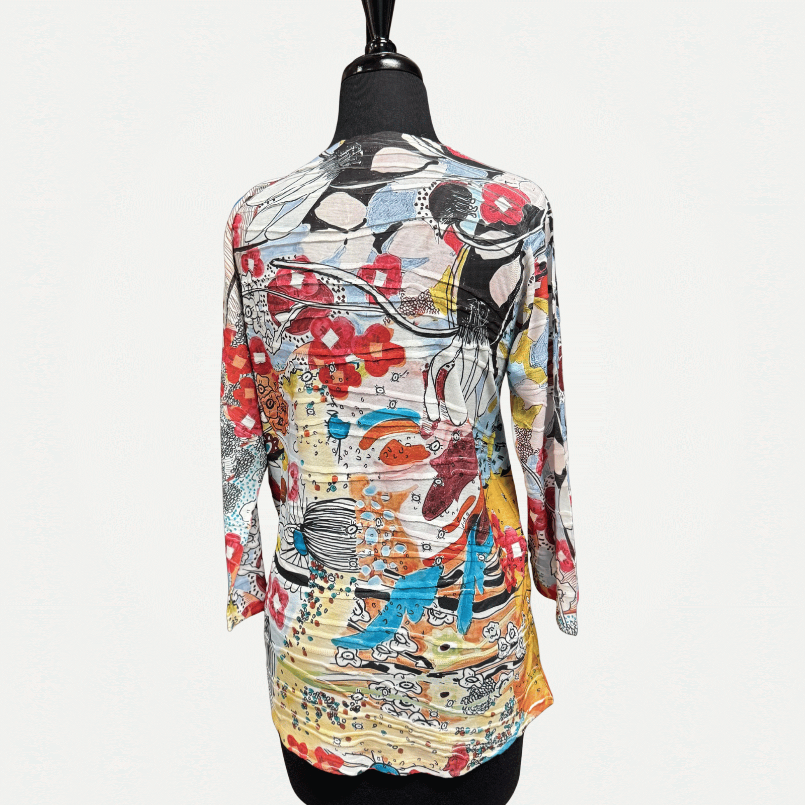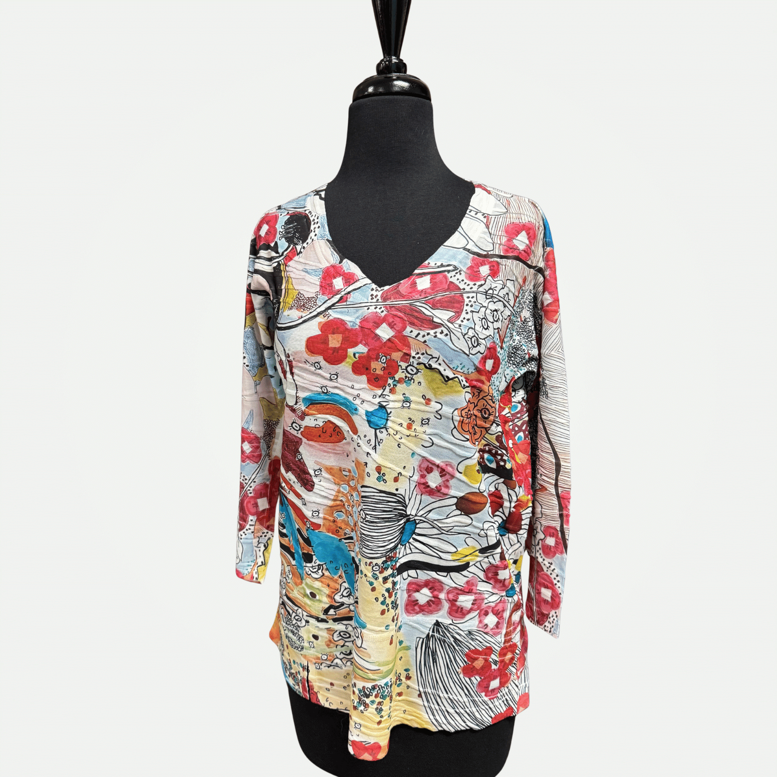 Three-quarter sleeve V-neck tunic with front slit, featuring a bold print.