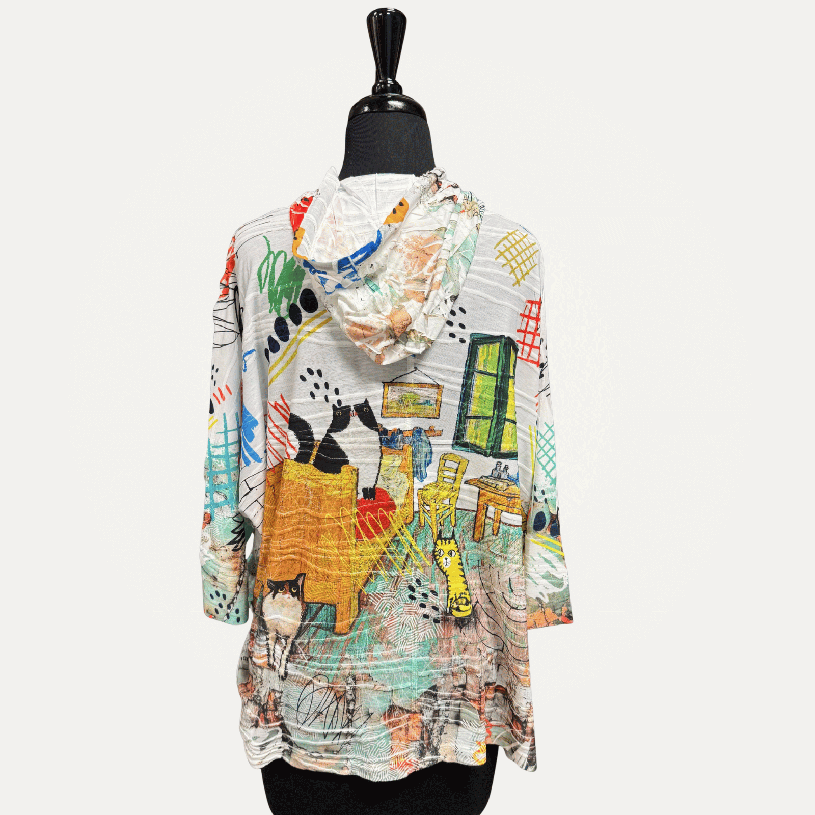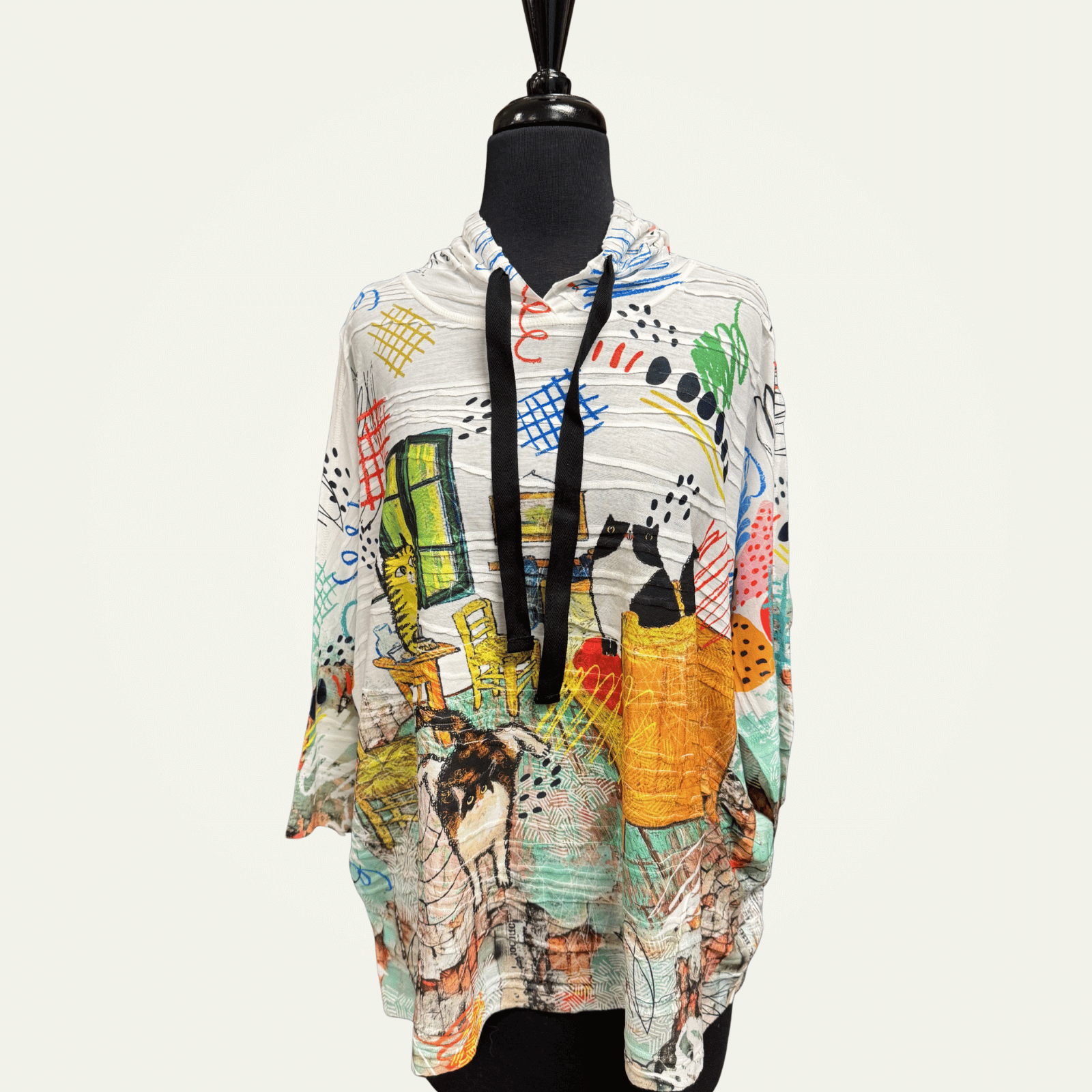 Three-quarter dropped sleeve hooded pullover, featuring a colorful print.