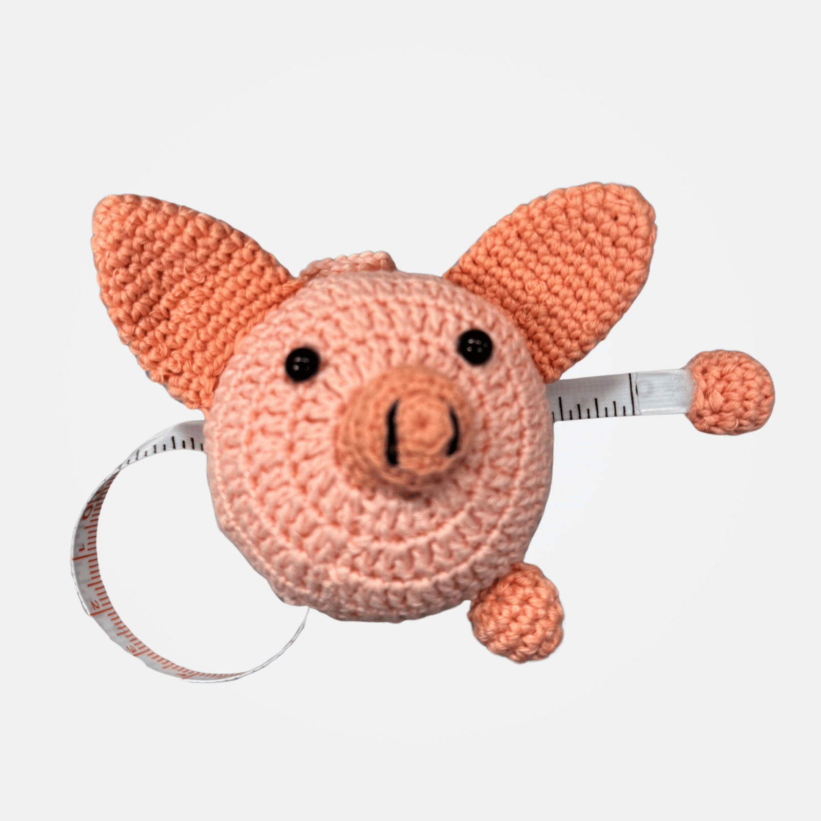 This delightful tape measure, featuring an adorable hand-crocheted pig design, displays both metric and imperial measurements on opposite sides. It extends up to 5 feet in length and retracts effortlessly.