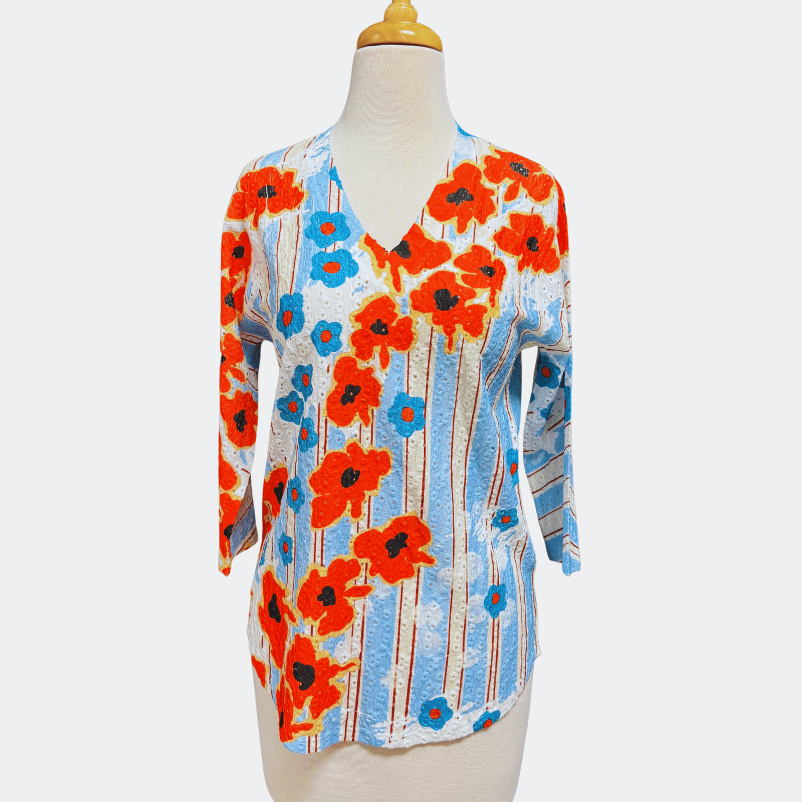 Three-quarter sleeve A-line top with V-neck placket, featuring a colorful poppy design printed on an eyelet fabric.