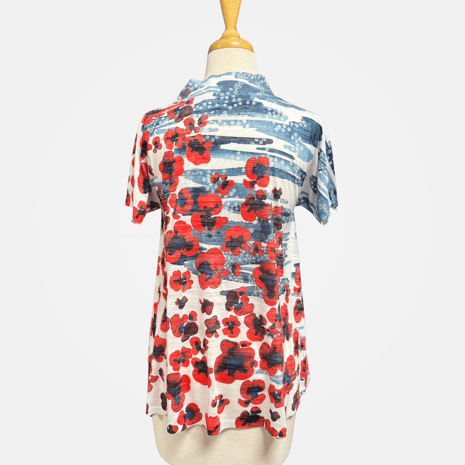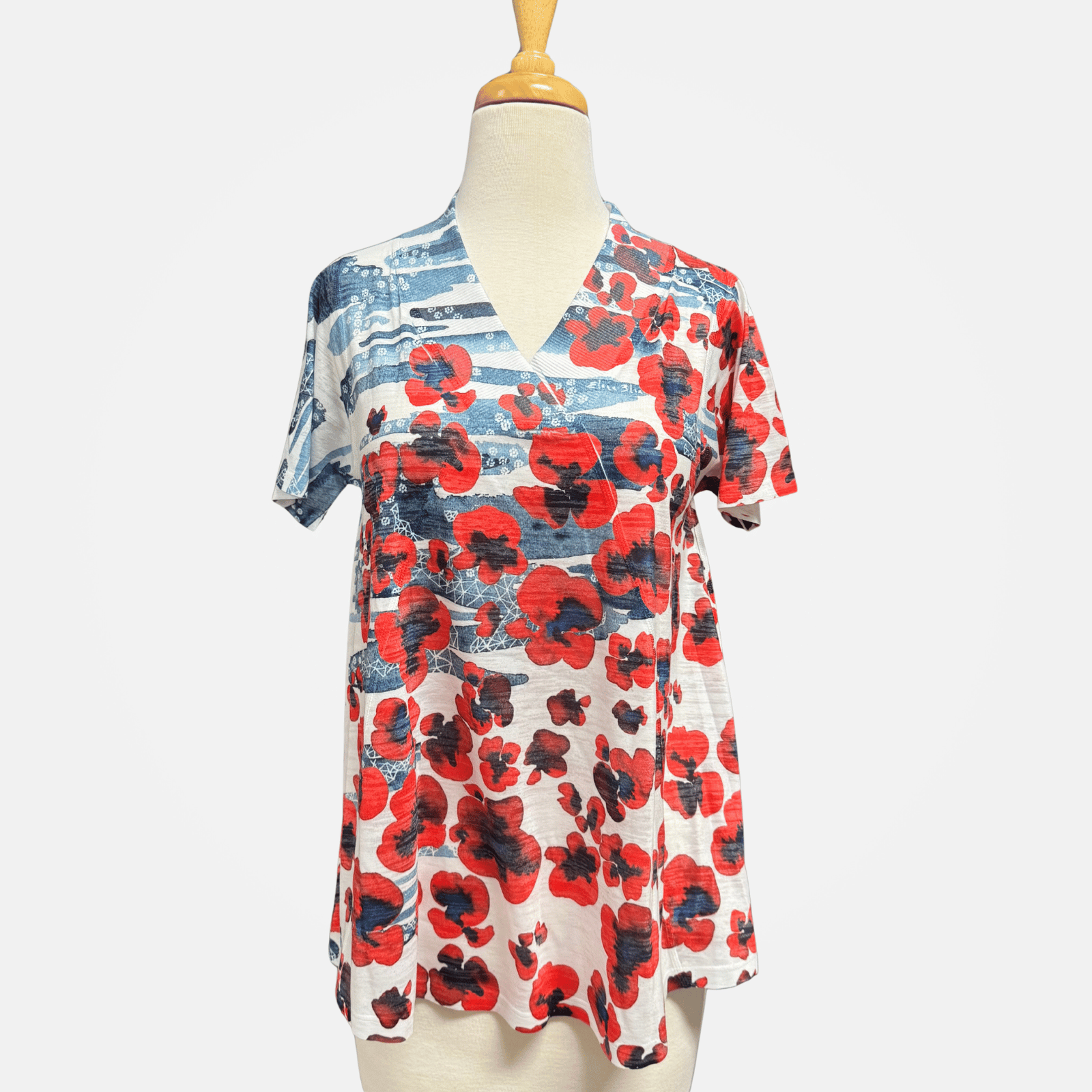 Short sleeve V-neck placket top, featuring a colorful burnout poppy print.