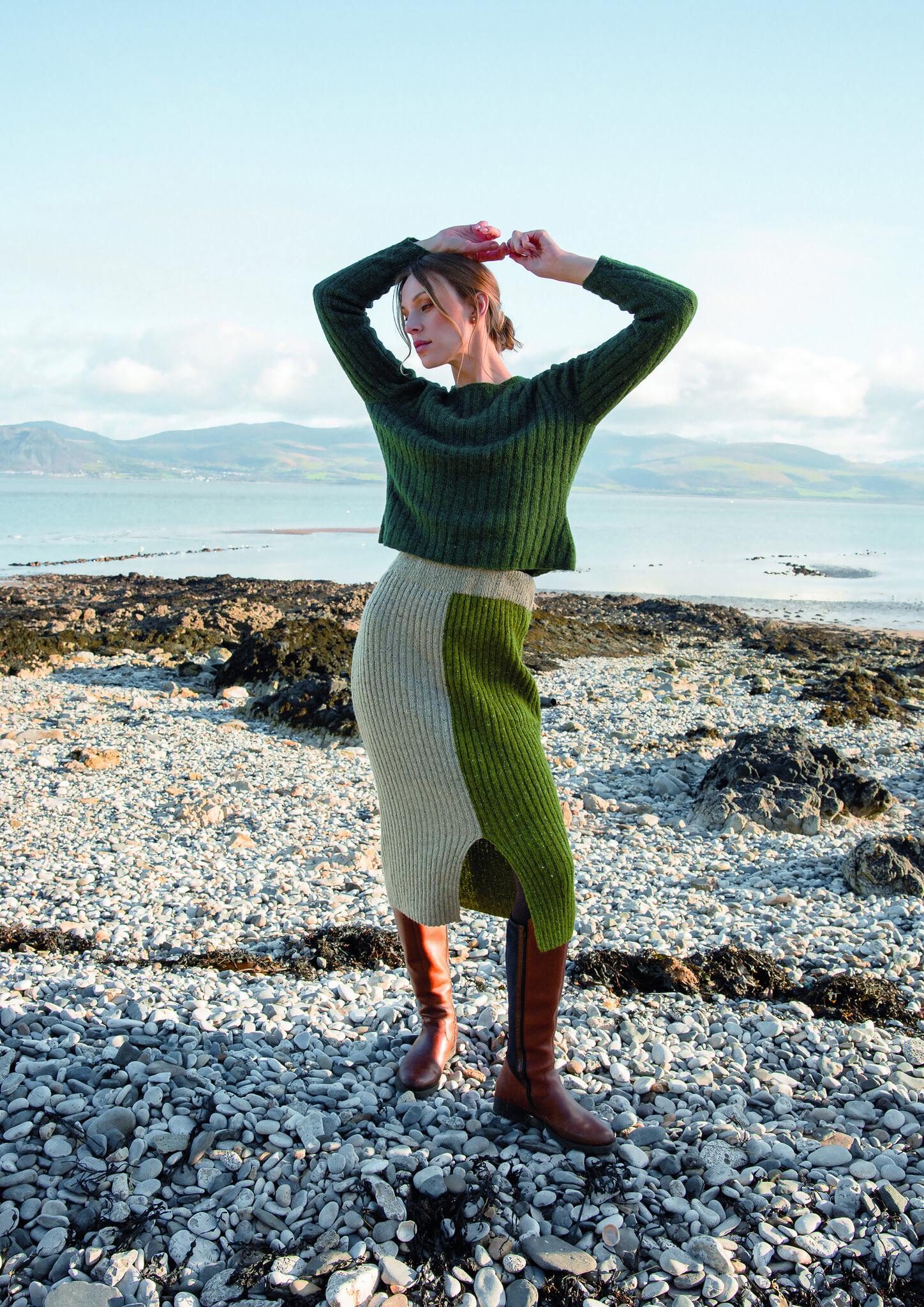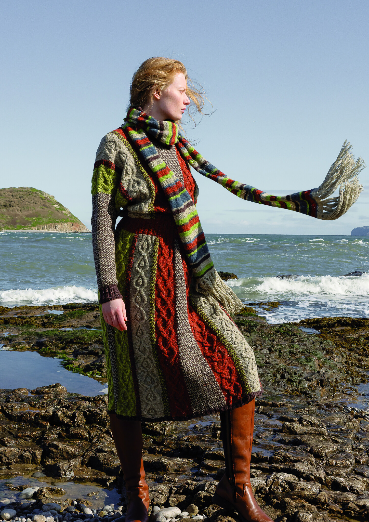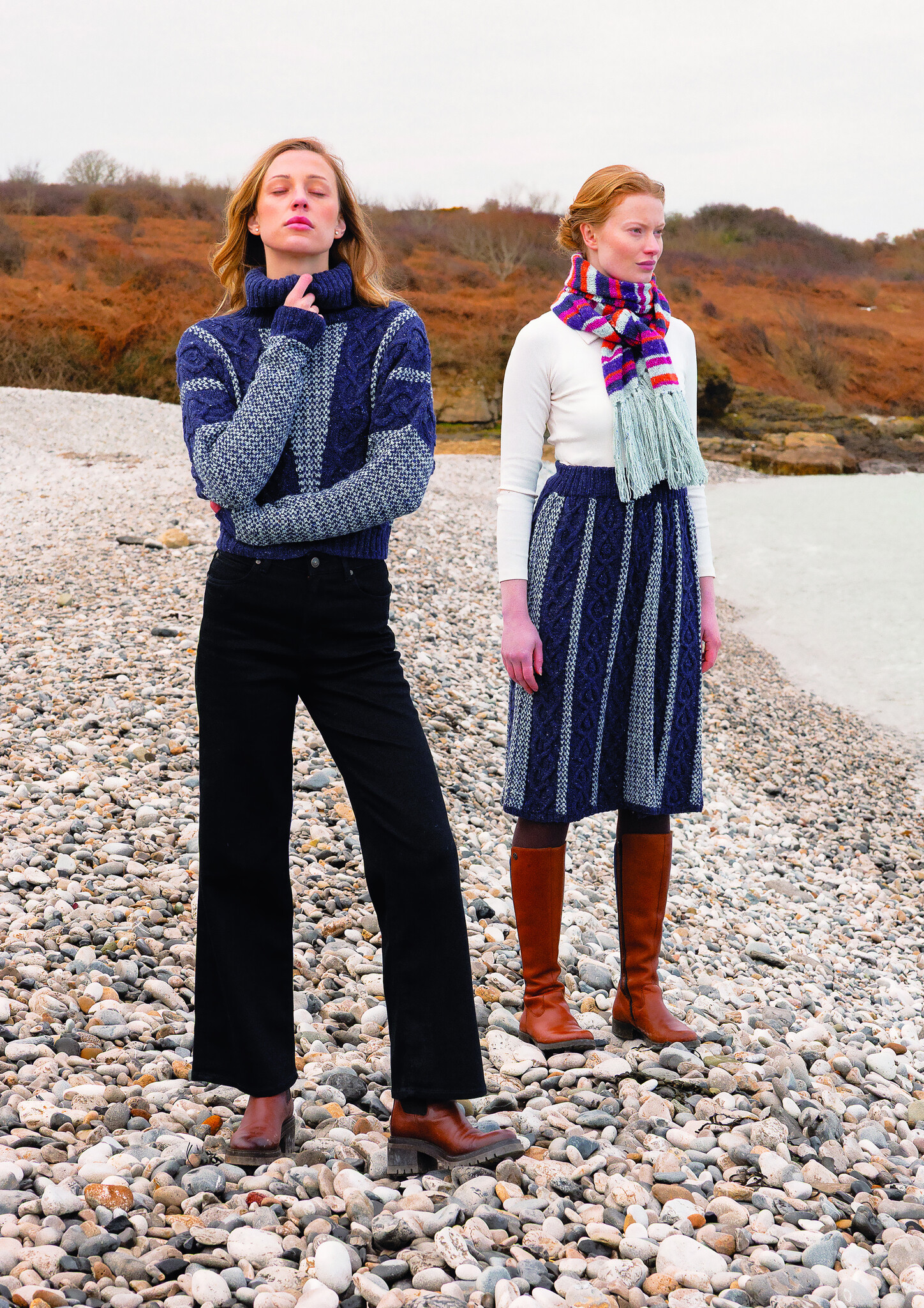 Photographed on a coastal landscape, this modern story shows the many ways to style knits today, including ribbed skirts, a knitted tunic, colorwork scarves, and cable stitch placement.
