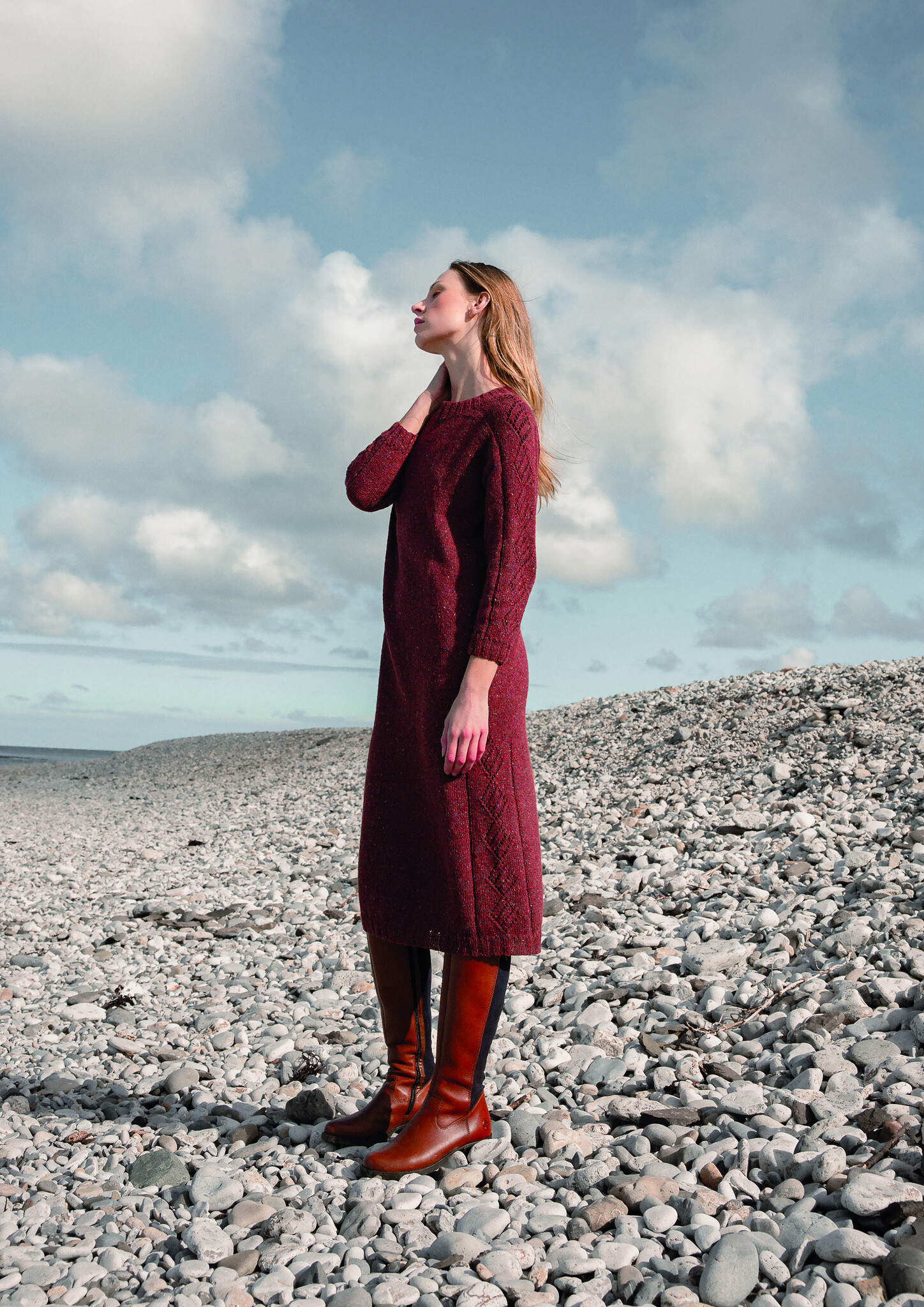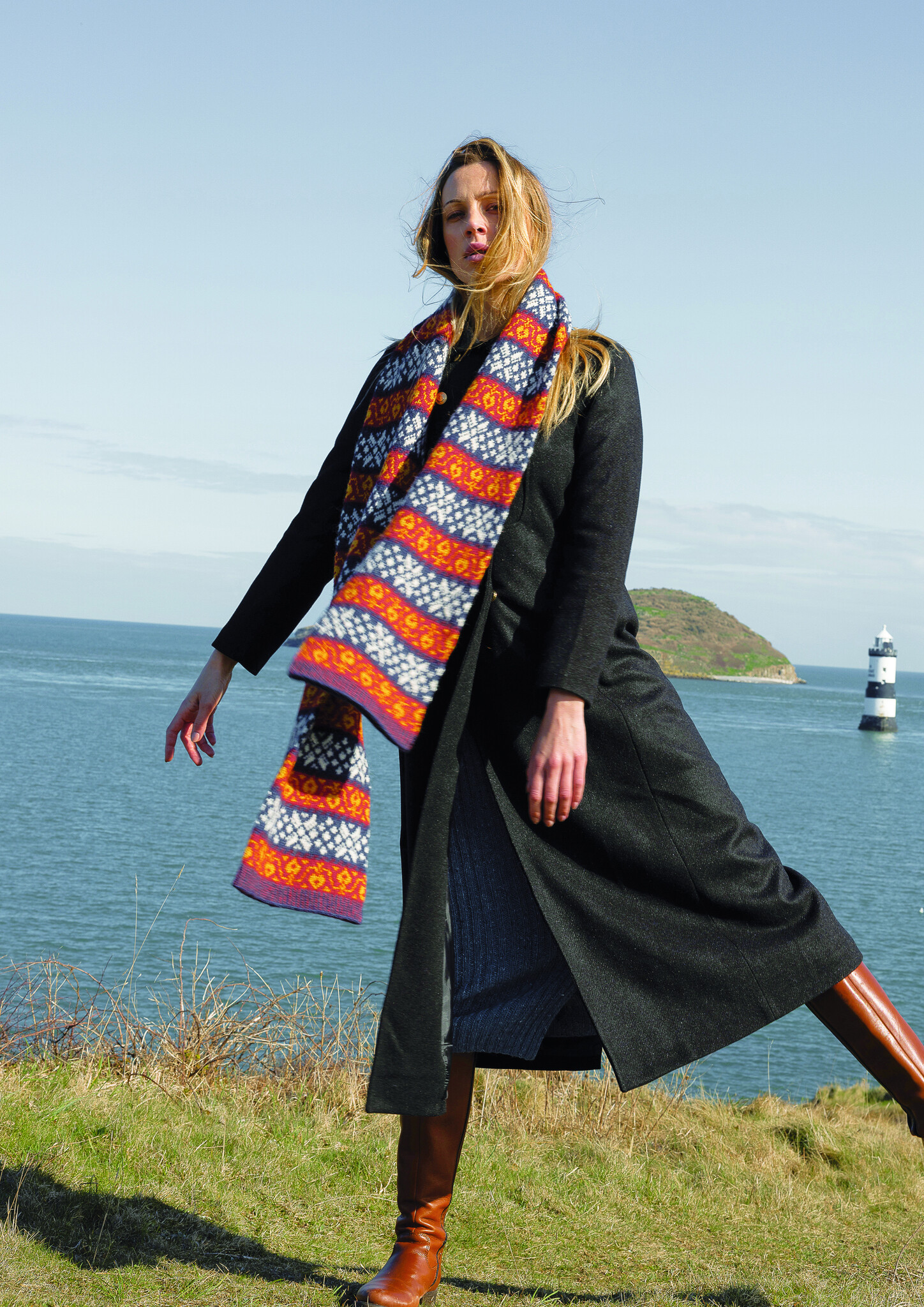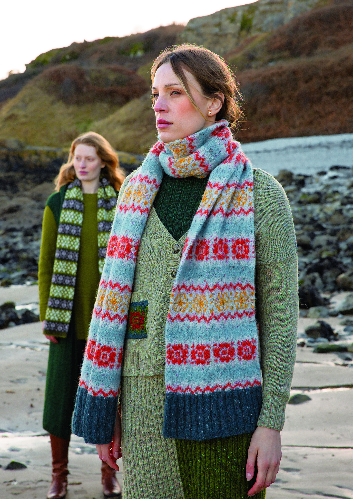 Photographed on a coastal landscape, this modern story shows the many ways to style knits today, including ribbed skirts, a knitted tunic, colorwork scarves, and cable stitch placement.