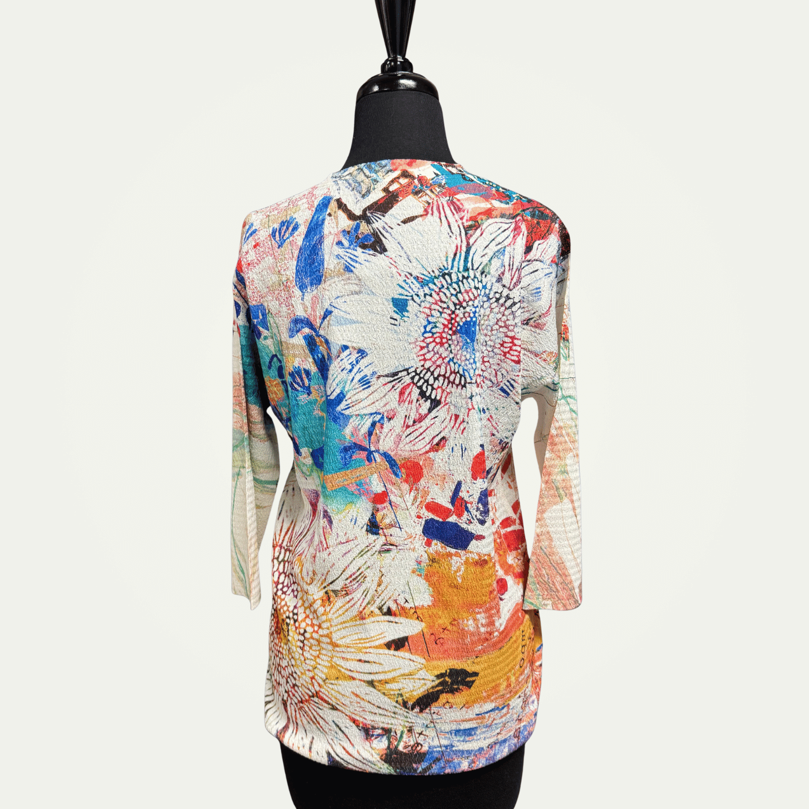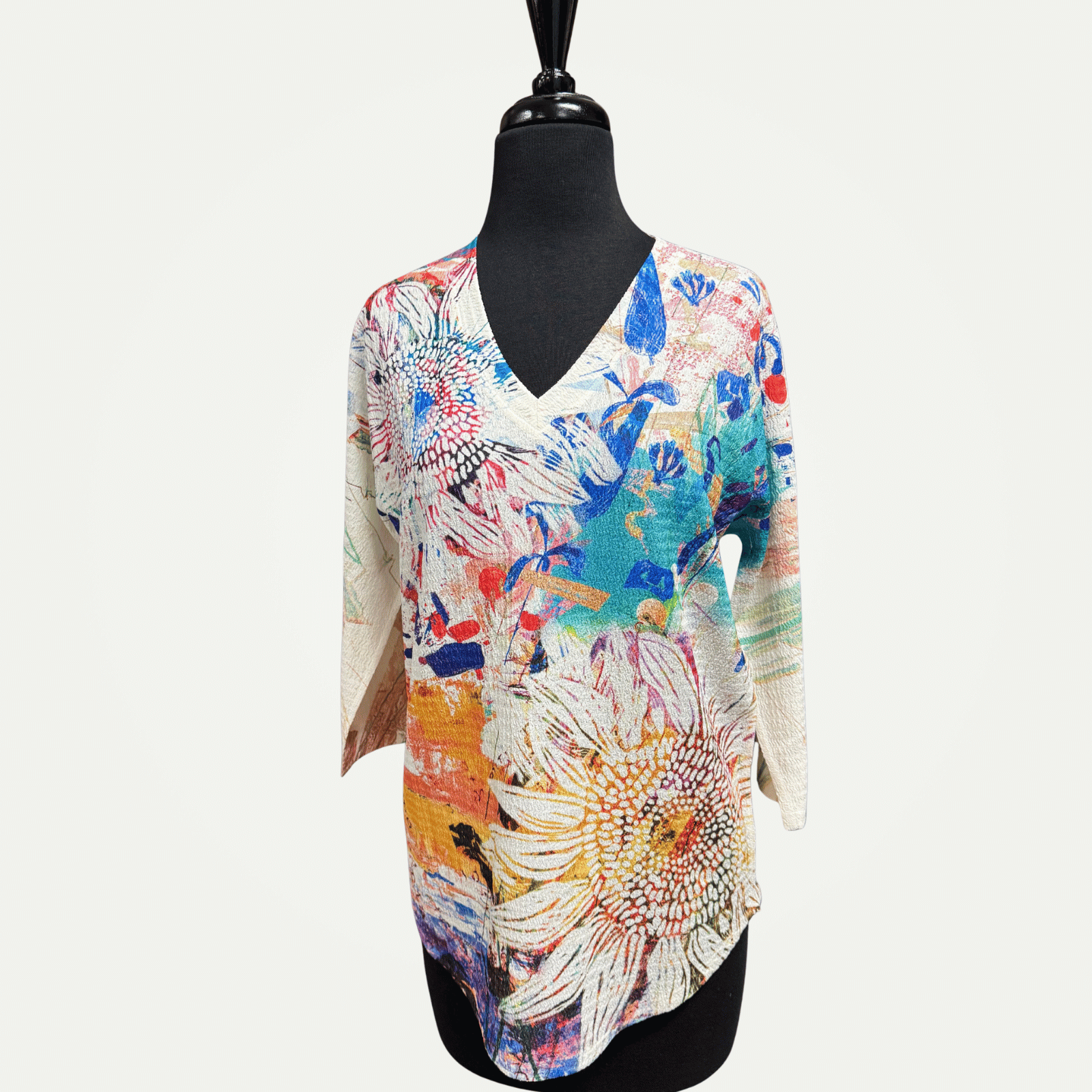 Three-quarter sleeve V-neck A-line top, featuring a colorful floral print.