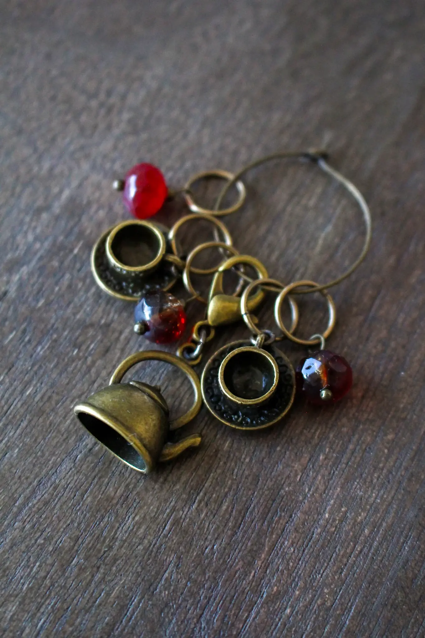 Each set consists of 5 ring stitch markers that fit up to a US10 needle and 1 removable progress keeper. Handcrafted in California with imported alloy metal components.